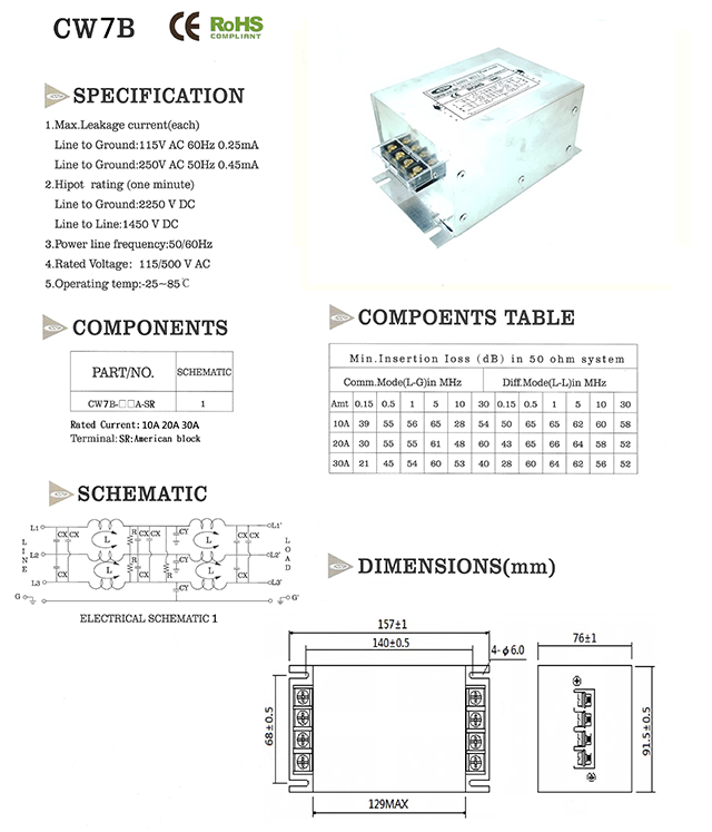 三相三线交流电源滤波器。